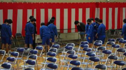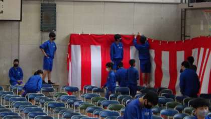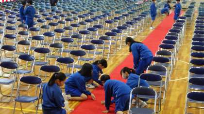 体育館での式場準備です。紅白幕を設置したり、赤じゅうたんのほこりを掃除したりと、熱心に取り組んでいる新3年生の姿がたくさん見られました。