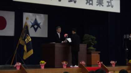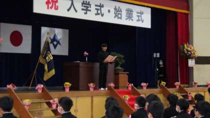 左は新1年生代表生徒による「新入生誓いの言葉」、右は在校生代表による「歓迎の言葉」の様子です。新1年生はこれから始まる中学校生活への決意を、在校生はその新1年生を温かく迎え、支えていくことを伝え合いました。二人ともとても立派な発表でした。