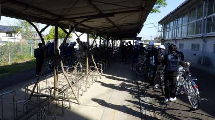 左の写真は、1年生で自転車登校をする生徒たちです。慣れない自転車登校ですので、交通安全指導や自転車点検等、今後も進めていきます。
