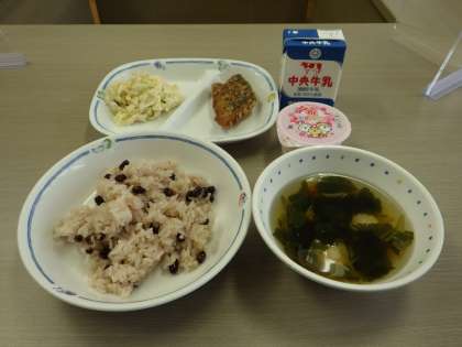 今日の給食は「入学・進級祝い献立」です。赤飯、えびしんじょのすまし汁、れんこんサラダ、さわらのから揚げ、いちごゼリーでした。