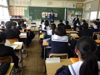 英語の授業です。ALT(英語の授業を支援してくださる外国人の先生)とコミュニケーションを図りながら、英語を活用する力を高めていきます。