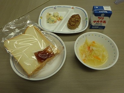 今日の給食は、パスタスープ、ビーンズマセドアン、ハンバーグ、スライスパン、いちごジャムでした。