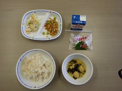 今日の献立は、若竹汁、ごぼうサラダ、かつおのそぼろ丼でした。こどもの日を迎えるということで、かしわもちが出ました。学校付近でも、こいのぼりが泳いでいる光景をよく見かけます。