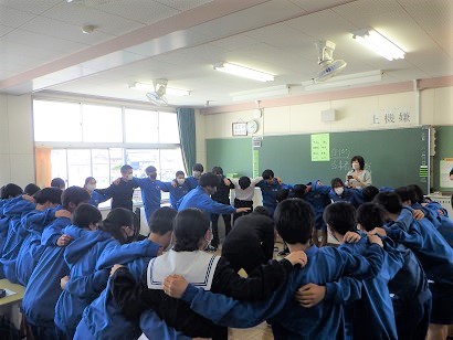 円陣を組んでいます。学級や友だちとの絆がより深まるような体育祭にしていきたいですね。