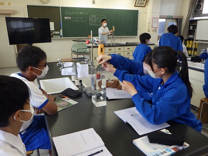 3年生の理科の授業です。水中の物体には浮力がはたらくことを実験で確認しています。
