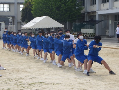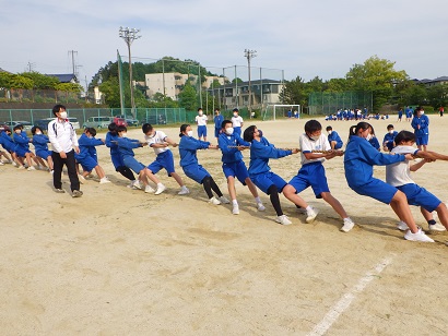 写真は、組団の中で綱引きの練習試合をしているところです。