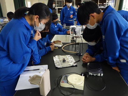 2年生の理科の授業です。金属が燃焼すると酸化して、別の物質になることを学びます。スチールウールを燃やし、重さを比べていきます。