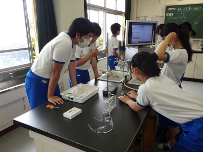 2年生の理科の授業です。鉄と硫黄を混ぜて加熱し、変化を調べます。化学変化に関する学習です。