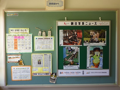 本館の東階段、2階と3階の踊り場に、図書館司書の方が作成していただいている掲示版があります。記念日カレンダーやニュースなど、ためになる内容がたくさん載っています。まだ見たことがない生徒の皆さんは、ぜひ見てください。