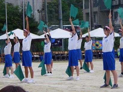 体育祭のフィナーレを飾る3年生の学年演技です。真剣な表情、風を切るフラッグの音、集中した動き、どれもが「かっこいい3年生」の姿を表していました。