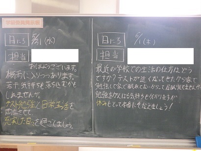 2年生の階に、生徒から生徒へ向けてのメッセージが書かれた黒板が設置されています。学校生活や家庭生活を自分で考え、自分でよりよくしていこうとする気持ちが大切です。