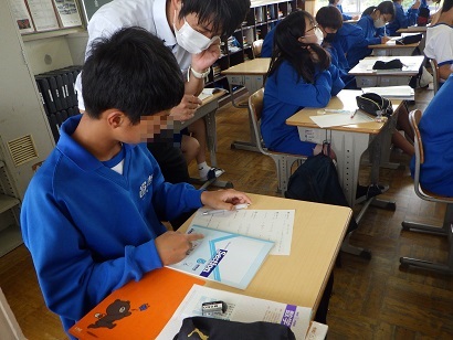写真は、1年生の数学の授業場面です。わからない箇所を進んで先生に質問していました。