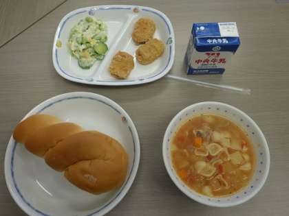 昨日に続いて、今日も「かみかみ献立」です。ツイストパン、ミネストローネ、えだまめサラダ、チキンナゲットでした。しっかりと噛んで食べることができるように、サラダにはえだまめ、きゅうり、キャベツなどの野菜が入っていました。