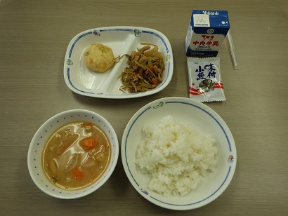 今日のメニューは、ごはん、米粉だんご汁、変わりきんぴら、豆腐しんじょ、乾燥小魚でした。乾燥小魚をポリポリ噛みながらいただきました。