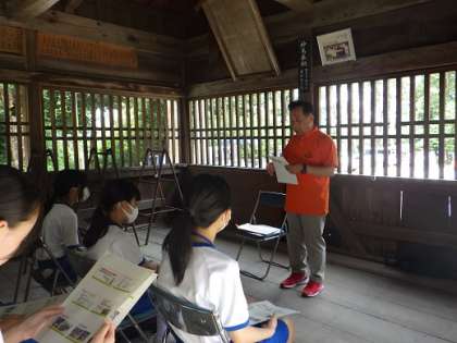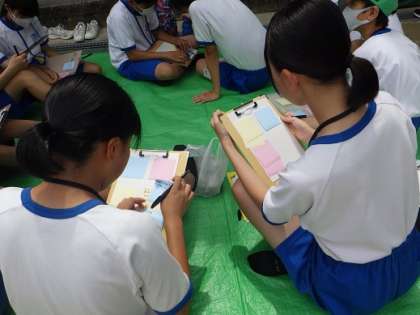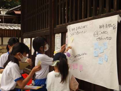 写真は、地域の方のお話を聞いたり、振り返りで考えを出し合ったりしている様子です。