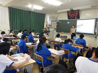 1年生の英語です。先生の発音に続いて、元気にリピートしています。