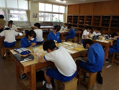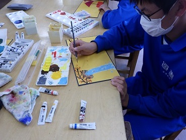 3年生の美術です。屏風絵に挑戦です。色や筆の使い方を工夫しながら、それぞれの作品に集中して取り組んでいました。