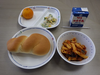 今日の給食です。献立は、ツイストパン、なすとペンネのトマト煮、ツナサラダ、冷凍みかんでした。暑い日でしたので、冷凍みかんはとてもおいしいです。