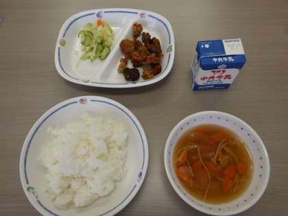 今日の給食は、ごはん、七夕汁、チーズサラダ、レバーとかぼちゃの甘辛煮でした。ビーフンを天の川に見立てた「七夕汁」と、星型のチーズが入った「チーズサラダ」が登場しました。