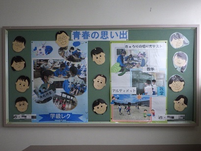 2年生の学年掲示板に、生徒作の掲示物が飾られています。レクや授業の様子について、写真などをうまくレイアウトしながらまとめられていました。大人顔負けの仕上がりです。