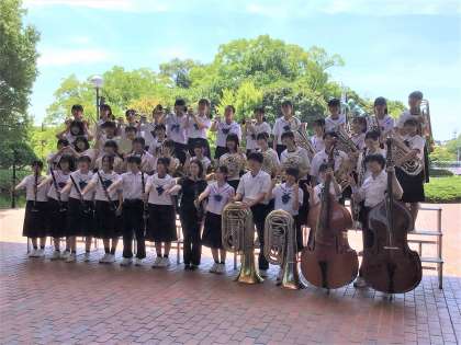 写真は、演奏後の記念撮影です。演奏時の真剣な表情から笑顔へと変わり、部員一人一人の達成感が感じられました。吹奏楽部の皆さん、素敵な演奏をありがとうございました。