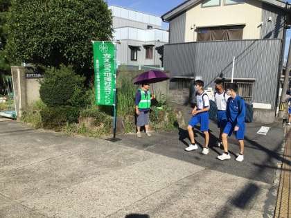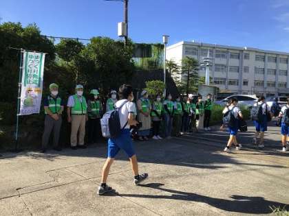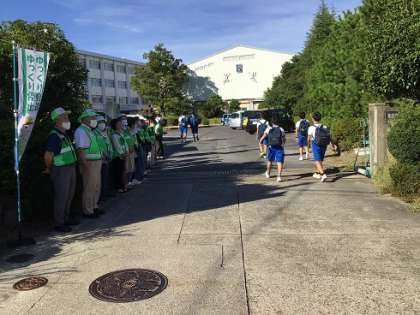 夏休みが終わり、今日から学校生活が再開しました。登校時に、民生児童委員の皆さんのあいさつ運動と育友会のあいさつ運動を行いました。写真は正門付近の様子です。