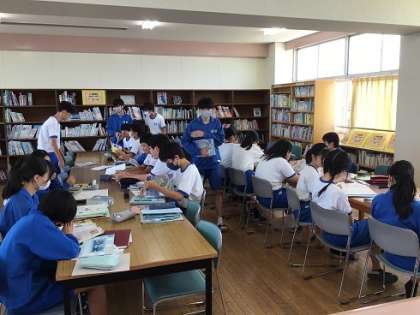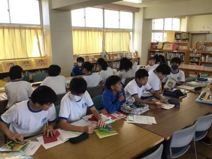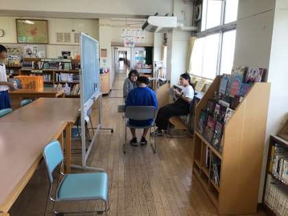 3年生の家庭科です。絵本の読み聞かせについて、個別の評価を行っています。絵本の準備などは、図書館司書の方に協力をいただいています。