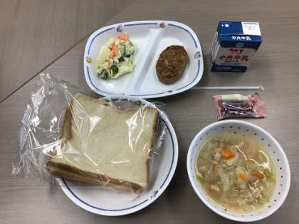 今日の献立にある「大麦と野菜のスープ」が、今回の「たべまる給食」です。あと、スライスパン、メープルジャム 、チーズサラダ(マヨネーズ風ドレッシング)、ハンバーグが出ました。