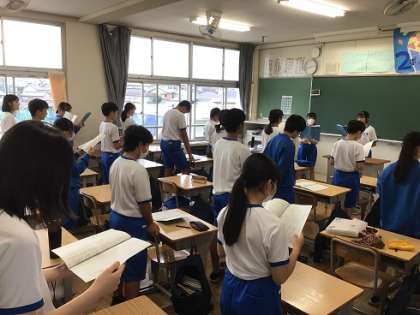 2年生です。担任の先生の言葉に続けて、みんなで発声練習に取り組んでいます。