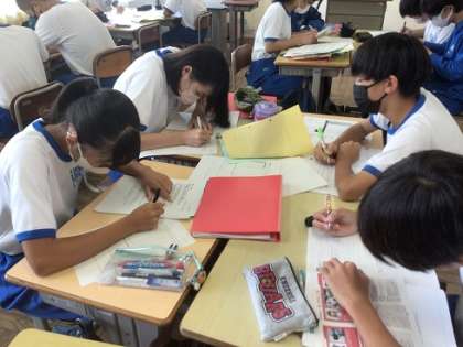 2年生の総合的な学習の時間です。キャリア教育の一環として、以前から取り組んでいる「インターン」。今日はアンケートの集計をしています。