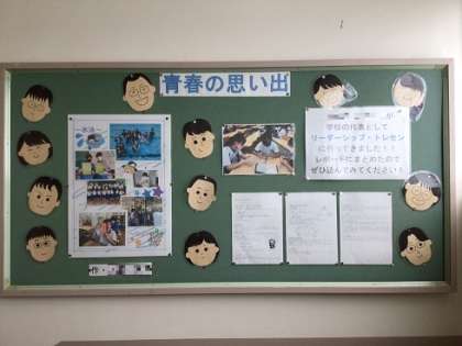 2年生の掲示板です。生徒が作った掲示物や、リーダーシップ・トレセンに参加した代表生徒のレポートが掲示されています。