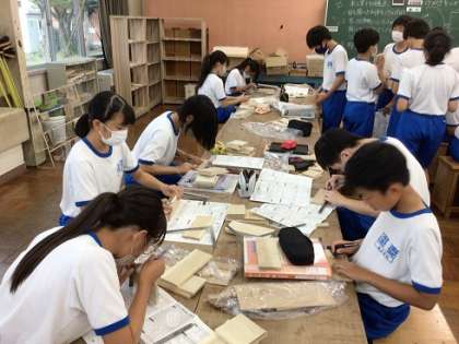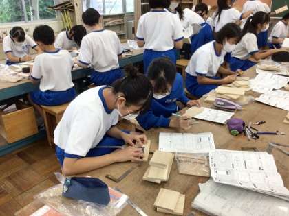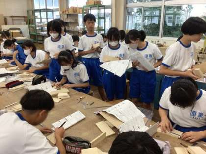 1年生の技術科です。木工室で行っています。木材を加工して、生活で役立つ小物入れや棚を作ります。がんばってよい作品ができるといいですね。