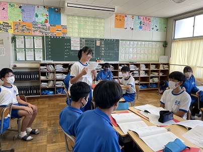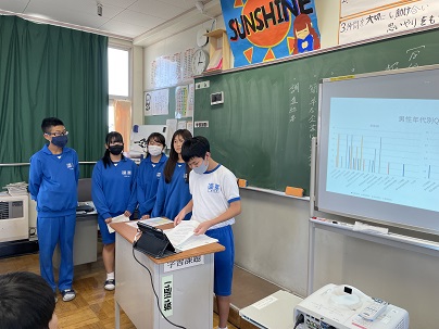 2年生の総合的な学習の時間です。キャリア教育の一環として、以前から取り組んでいる「インターン」。今日はアンケートの結果について、発表をしています。