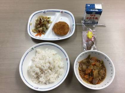 今日の給食は、「月見献立」として、豚丼・さといもコロッケ・おかかあえ・月見だんごが出ました。