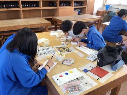3年生の美術です。抽象画に挑戦しています。抽象画を見る力や感じ取る力を高めながら、美術への理解を深めていきます。