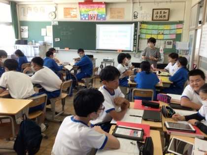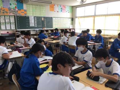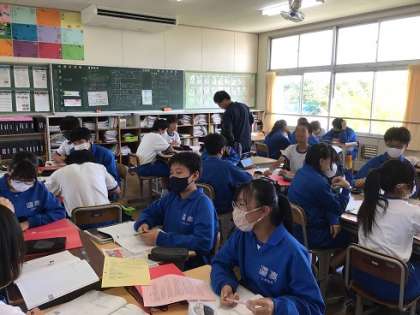 2年生の総合的な学習の時間です。継続的に取り組んでいる「インターン」の学習です。キャリア教育の一環として行っています。企業や仕事について、対話的な学習を大切にし、自分事として考えることができるように進めています。