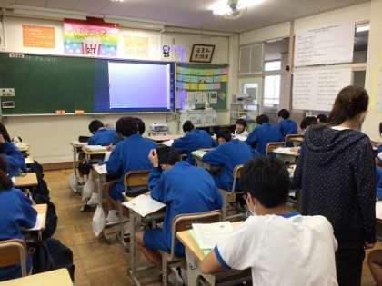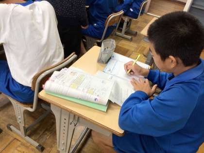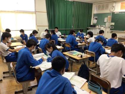 2年生の英語科です。英語を使って、感謝の手紙を書くことに取り組んでいます。友だちや家族、先生など、手紙の相手を自分で決めて書いていきます。英語での手紙の書き方について学びます。