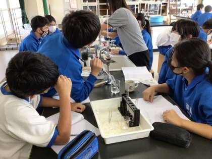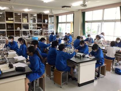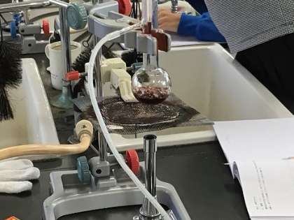 10月6日(金)授業の様子 公開日 2023/10/07 更新日 2023/10/07 お知らせ 1年生の理科です。赤ワインを加熱して、エタノールをとり出せるか調べています。沸点のちがいを利用し、2種類の液体の混合物から物質を分離できることを実験から学習していきます。