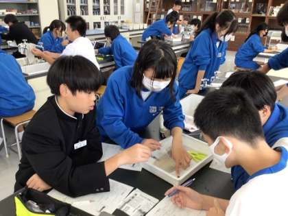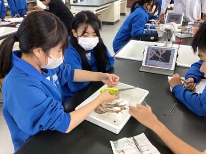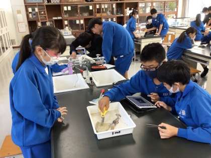 10月11日(水)授業の様子1 公開日 2023/10/12 更新日 2023/10/12 お知らせ 2年生の理科です。イカの解剖を通して、生物の体のつくりについての共通点や相違点を確認し、分類の視点を学んでいきます。 普段なかなかできない実習ですので、いつも以上に積極的取り組む逢中生でした。