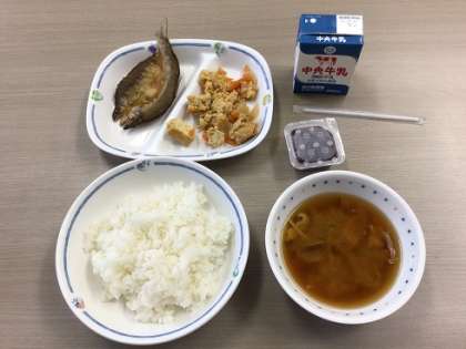 今日の給食は、豊田ブランドの日です。豊田ブランドの日とは、豊田市でとれた食材を使用した献立の日です。きのこのみそ汁、とよたチャンプルー、あゆの一夜干し揚げ、ブルーベリーゼリー、ごはんが出でました。