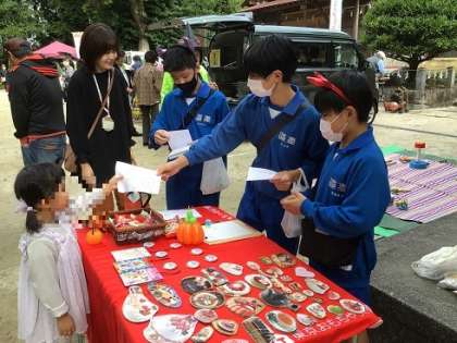 10月14日(土)小清水ふれあい朝市おもちゃ広場1 公開日 2023/10/16 更新日 2023/10/16 地域学校共働本部 宮口神社の境内で行われた朝市で、逢中生ボランティアがおもちゃ広場を開催し、大いに活躍しました。今回はハロウィンをテーマに、ゲームのスタンプラリーを行いました。