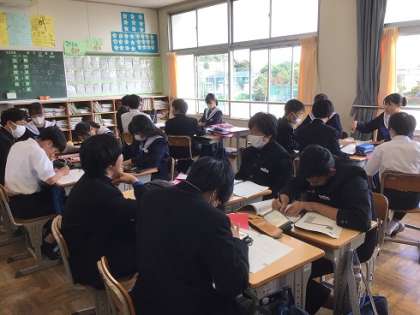 2年生の総合的な学習の時間です。継続的に取り組んでいるインターンの学習です。調べたことを班でまとめながら進めています。