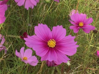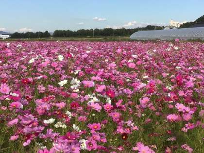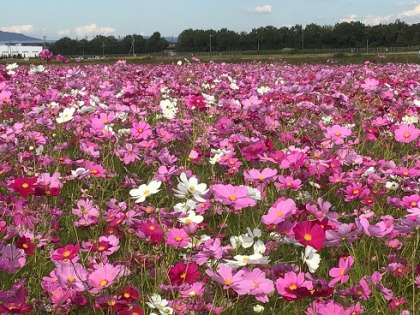 本地町にある本地プラネットのコスモスが、見頃を迎えています。このコスモスは、7月に逢中生ボランティアが、地域の方々と共に種まきをしたものです。