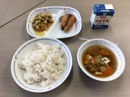 今日の献立にある「もみじごはん」が、今回の「たべまる給食」です。あと、けんちん汁、カレイフライが出ました。「もみじごはんの具」を麦ごはんに混ぜて、秋をイメージした「もみじごはん」としていただきました。