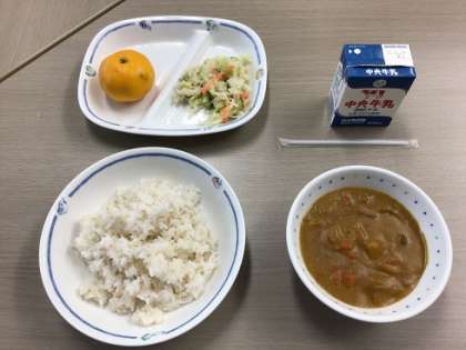 今日の献立は、麦ごはん、カレーライス、チキンサラダ、みかんでした。
