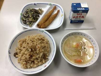 今日の献立は、三河赤鶏五目ごはん、粕汁、骨太サラダ、ししゃもフライでした。