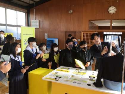 中の写真は、検討委員会の取組の様子について参観にいらっしゃった外部の方とともに、情報交換をしている場面です。
