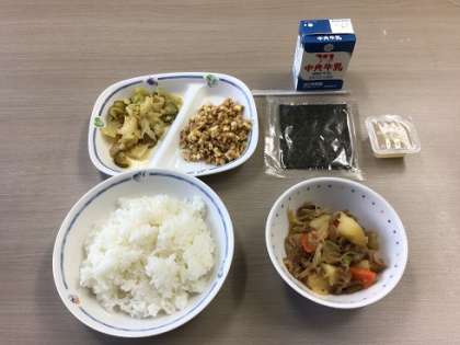 11月27日は、あいち県民の日です。今日の給食はそのことにちなみ、愛知県でとれた食材を使用した献立でした。ごはん(米…大地の風)、肉じゃが(豚肉…ひまわりポーク)、納豆巻き(大豆…フクユタカ)、なしゼリーでした。