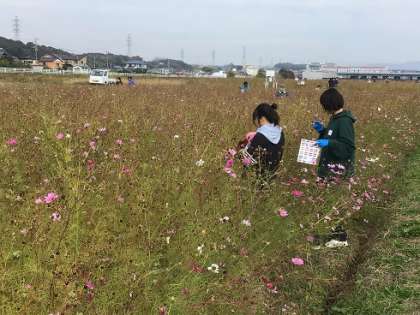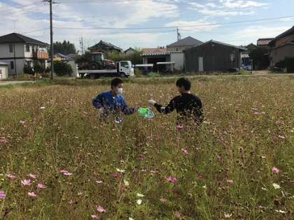 逢中生ボランティアががんばってくれています。今日は、7月に種まきをした本地プラネットのコスモス畑で、種を集める活動に取り組みました。