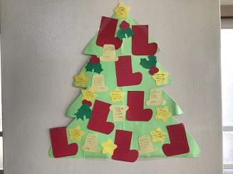 12月7日(木)あたたかいメッセージ 公開日 2023/12/07 更新日 2023/12/07 お知らせ 2年生の学級の前にある掲示物です。クリスマスツリーをイメージしていますが、それぞれの飾りの中に、仲間への感謝などのあたたかいメッセージが書かれています。寒い季節ですが、心があたたかくなりますね。